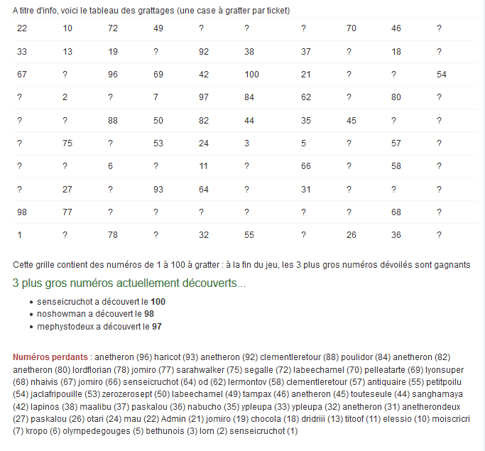 3 des 66 généreux donateurs gagneront une récompense via une tombola (1 don = 1 ticket). Admirez le grand écart de Senseicruchot, qui tire le 1 et le 100.
